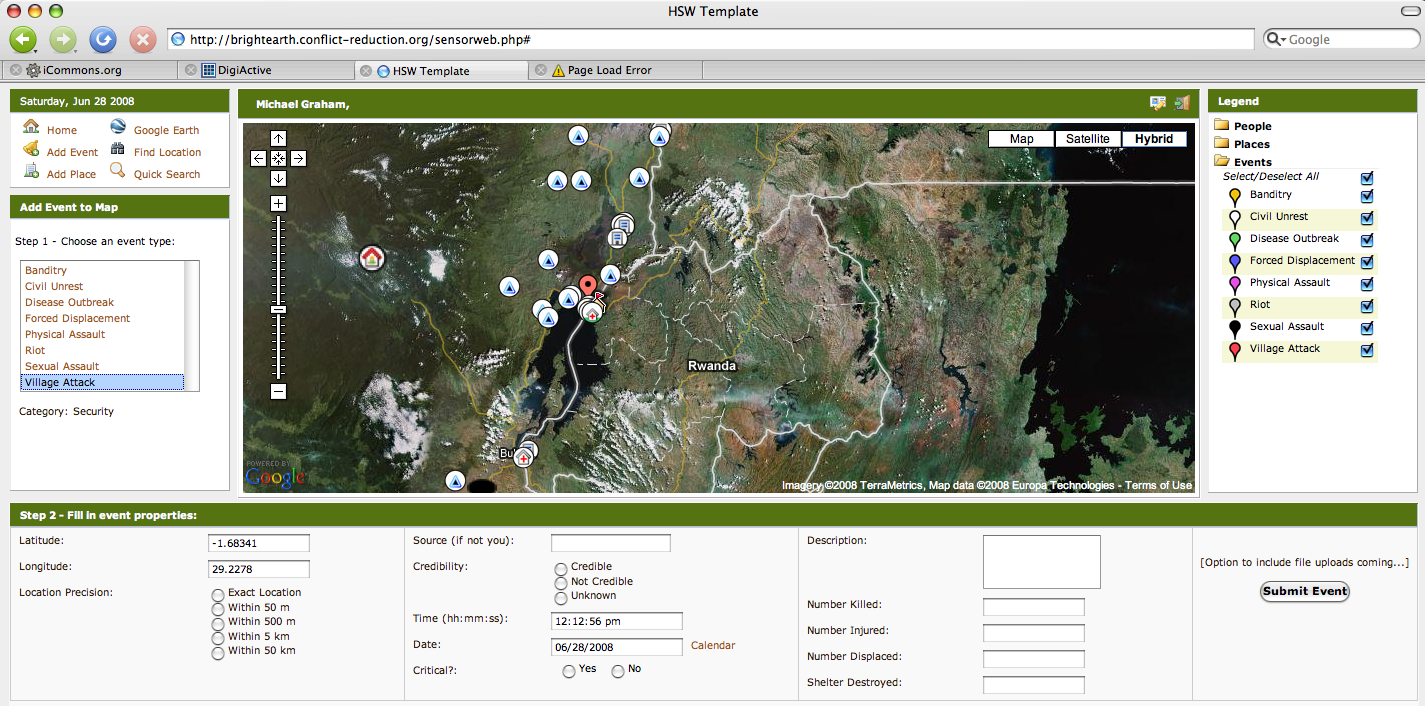 Erik Hersman and I had a particularly fruitful day-long brainstorming session in April 2008. He was interested in the lessons learned and best practices from the humanitarian side while I wanted to learn more about the technical aspect of crisis mapping. The conflict early warning community has had to address the challenges of information collection, data validation (quality control), indicator development and frameworks, data analysis, field-based security of monitors, etc.