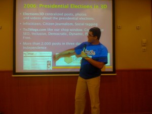 - In Venezuela the problem is not about freedom of speech but rather freedom of communication. People at home do not talk about politics, they do not have confidence to discuss the issues, and therefore you do not have a sense of community. People are also tired of talking politics since nothing changes, much. Only 20% of the population have acess to the Internet. When elections happen, it’s like a national sport. Elections3D is a website set up to centralize blog posts, photos and videos about the elections. They also used SMS an Twitter for fast discourse. They used SMS to send text messages to more than 2,000 people in less than a minute. Luis Diaz concluded his presentation on Venezuela with some lessons learned: tagging is effecient, and needs exhaustive and universal keywords to be found by the greater public; blogs are the nerve center, but the richest platform is the diversity; the blogosphere is subjective and this is important since it contains the political rainbow in a nation withou diaologue. Luis showed a picture of an indigenous Colombian, in the middle of the rainforest, using his mobile phone. “This is important, this the future,” he said with an applause from the participants.