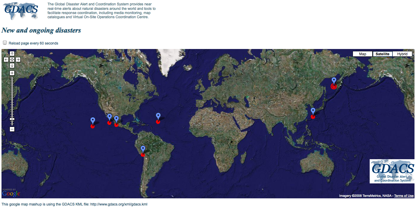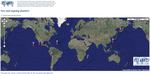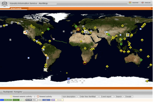 Why the lag? Most likely because the majority of conflict data is not geo-referenced (beyond the country level, or admin 1). We’ve also been more interested in the temporal dimension of conflict forecasting rather than the spatial dimension—even though the latter can reveal important spatial patterns useful for temporal forecasting. In any case, the disaster community continues to be in the lead vis-a-vis crisis mapping. Of course, they have the advantage of drawing on a wide network of physical sensors around the world to monitor spatially and in real time such hazards as earthquakes, hurricanes, etc. See for example the real-time updated maps by GDACS and Havaria below.