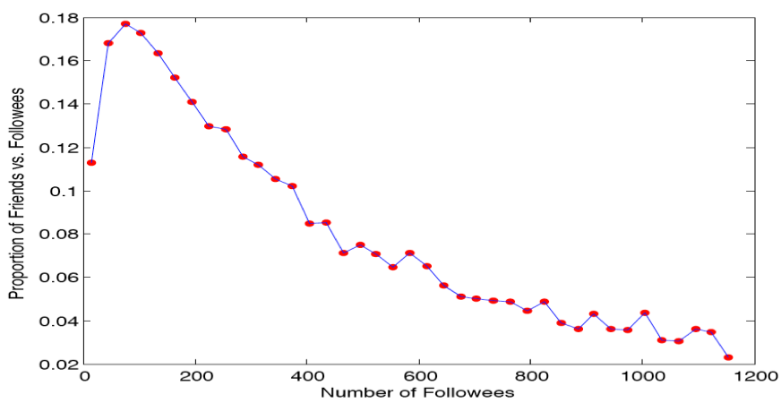 In turn, the figure below depicts the proportion of friends versus followees as a function of followers. The curve initially increases but rapidly approaches zero as the number of followees increases.