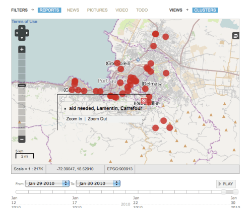 She was clearly referring to the interactive maps launched by Ushahidi, Open Street Map (OSM) and Sahana as well as the free “4636” SMS number that Ushahidi and partners set up with the support of the State Department. Haitians can send a text to 4636 to report their location and urgent needs. These SMS’s are translated into English and mapped in near real-time on Ushahidi-Haiti.