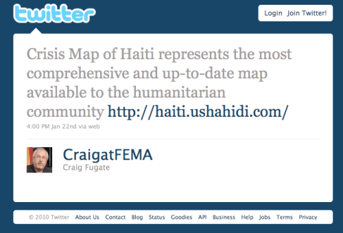 I was glad to meet Jaro when he was here managing the Ushahidi project in February and March. It sounded like making the incoming data actionable, and finding groups to follow up on it, were indeed his most difficult challenges. A UN worker was complaining about Ushahidi to me a few days ago, saying it’s unreliable. Reporting directly from earthquake victims is never perfectly reliable, of course, but what is? It should be a major input into any humanitarian’s workflow and for most of them here in Haiti, it isn’t. They’re too self-assured, thinking they know better than those they’re supposed to serve. That Haitians always exaggerate and are out to grab whatever aid they can. Part of that mentality is race- and class-ism. Ushahidi can amplify the voices of Haitians, but if humanitarian partners don’t care about those voices to begin with – what then?