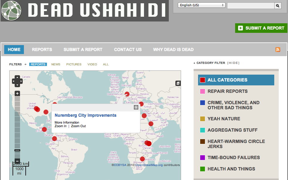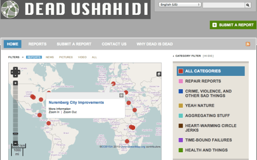There’s a new Crowdmap in town called DeadUshahidi. The site argues that “Mapping doesn’t equal change. Using crowdsourcing tech like Ushahidi maps without laying the strategic and programmatic ground work is likely not going to work. And while we think great work has been done with crowdsourced reporting, there is an increasing number of maps that are set up with little thought as to why, who should care, and how the map leads to any changes.”