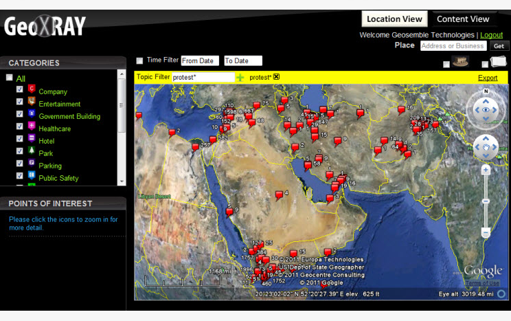 To clarify one point above, one major differentiator between GeoXray and a number of other systems is that typically, most systems will map locations in text only if they already have geotags – lattitude and longitude – associated with a place name. The problem is, most people don’t put in that information when they tweet, blog, or write news and other textual documents. As a result, untagged documents would be missed by these systems.