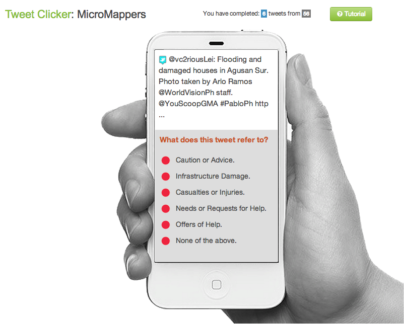TweetClicker:  This Clicker invites volunteers to tag tweets based on categories specified by an organization like the UN, Red Cross or FEMA. These categories could include those from the UN Cluster System or other information needs.