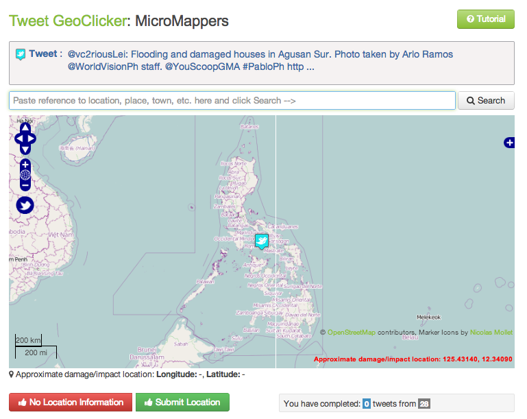 TweetGeoClickerTweetGeoClicker: This Clicker invites volunteers to geo-tag tweets (that are not already automatically geo-tagged). The Clicker’s mini-tutorial provides a list of tips on how to find the GPS locations of places mentioned in a given tweet.