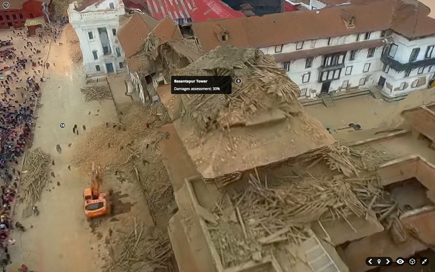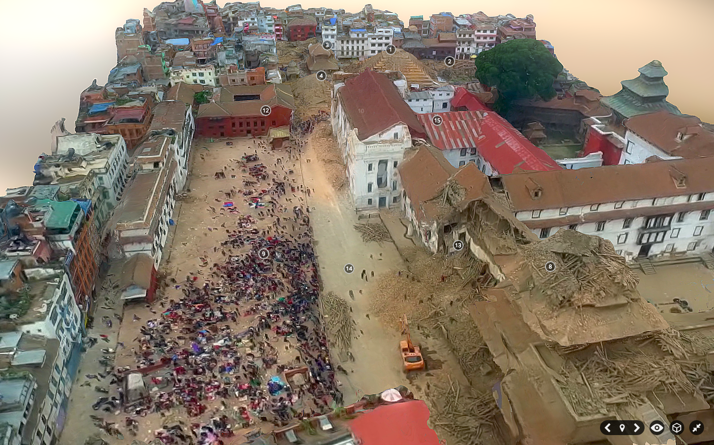 In fact, Matthew already used SketcFab to annotate a 3D model of Durbar Square neighborhood in downtown Kathmandu post-earthquake. He found an aerial video of the area, took multiple screenshots of this video, created a point cloud from these and then generated a 3D model which he annotated within SketchFab. This model, pictured below, would have been much higher resolution if he had the original footage or 2D images. Click pictures to enlarge.