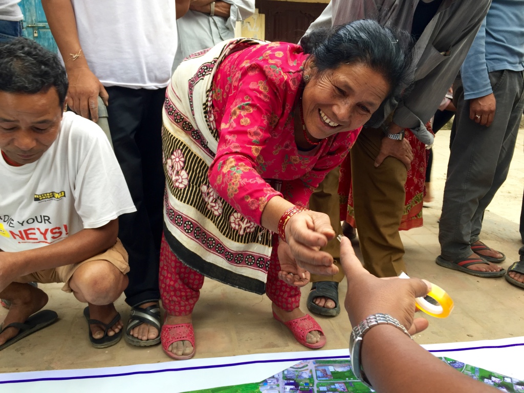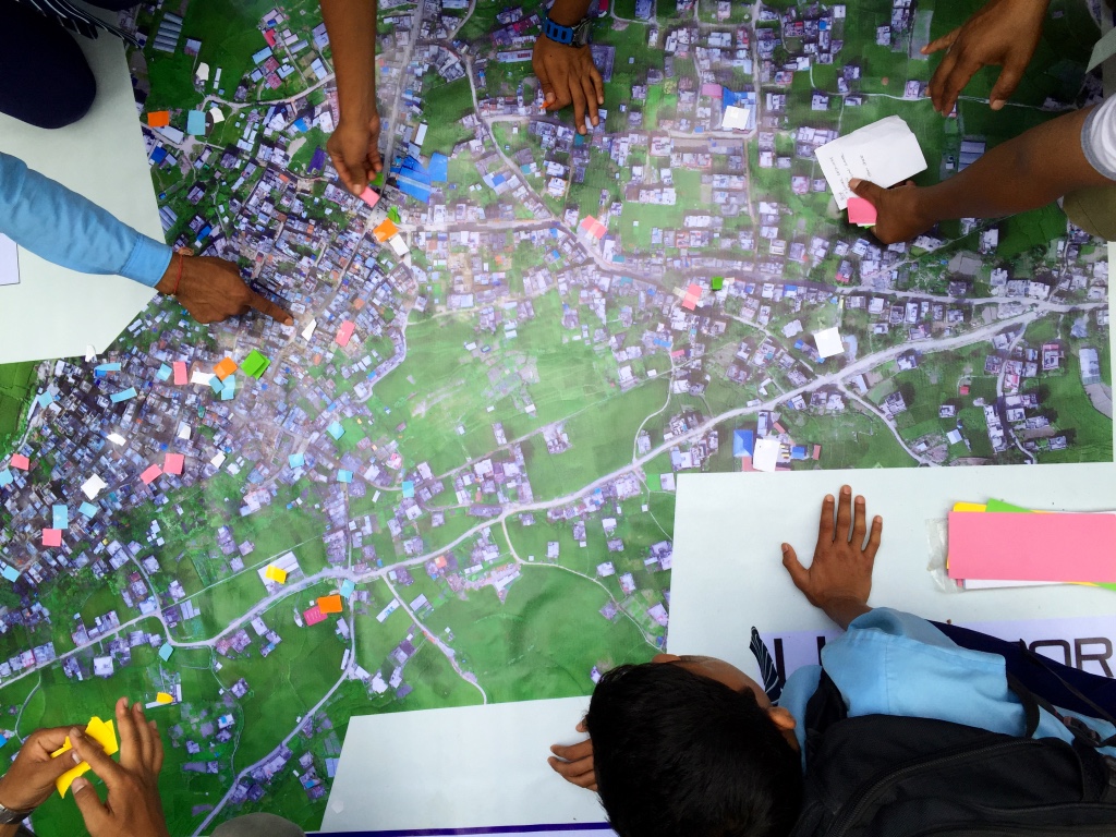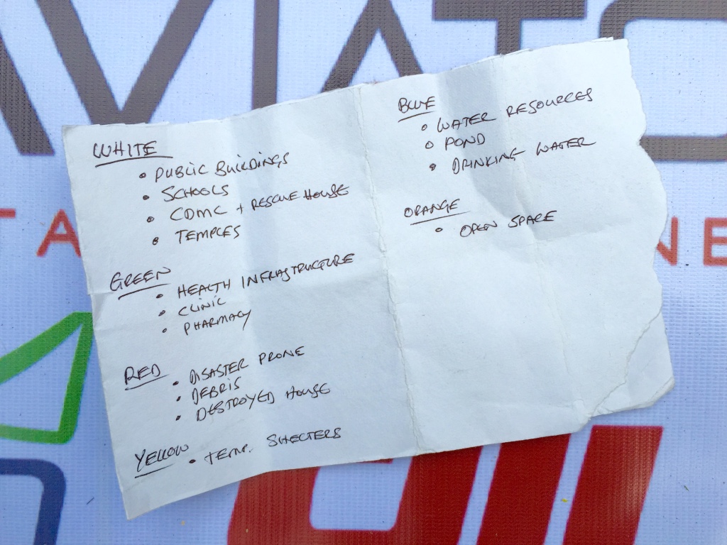 We thus used these banner-maps and participatory mapping methods to engage the local community directly. We invited community members to annotate the very-high resolution aerial maps themselves by using tape and color-coded paper we had brought along. In other words, we used the aerial imagery as a base map to catalyze a community-wide discussion; to crowdsource and to visualize the community’s local knowledge. Participatory mapping and GIS (PPGIS) can play an impactful role in humanitarian and development projects, hence the initiative with our local partners (more here on community mapping).