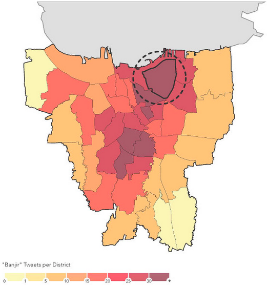 In the above video, the blue line that stretches diagonally across the map is Highway 63, which was the primary evacuation route for many in McMurray. The video shows where the general population of Facebook users is moving over time at half-hour intervals. Notice that the blue line becomes even denser between 1 and 3 A.M. local time. Reports from the mainstream media published that afternoon revealed that many drivers ended up having to “camp” along the highway overnight.
