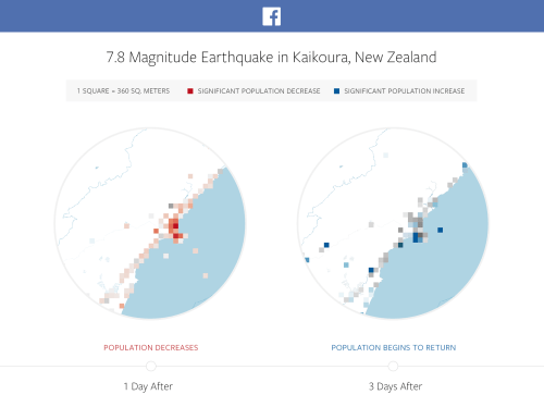Take the map below of the Kaikoura Earthquake in New Zealand as another example. The disaster maps for the earthquake show the location and movement of people in Kaikoura following the disaster. One day after the earthquake, we notice that the population begins to evacuate the city. Using news articles, we can cross validate that residents of Kaikoura were evacuated to Christchurch, 200 kilometers away. Several days later, we notice from the Facebook maps that individuals are starting to return to Kaikoura, presumably to repair and rebuild their community.