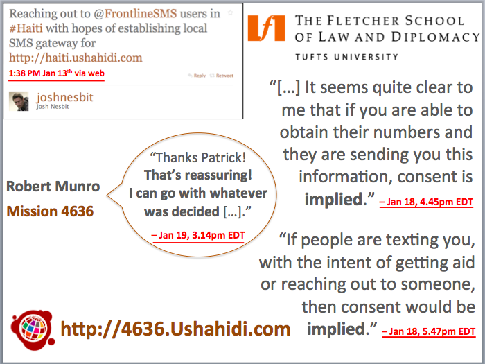 Time was not a luxury we had; an an entire week had already passed since the earthquake. We were at the tail end of the search and rescue phase, which meant that literally every hour counted for potential survivors still trapped under the rubble. So we immediately reached out to 2 trusted lawyers in Boston, one of them a highly reputable Law Professor at The Fletcher School of Law and Diplomacy who also a specialist on Haiti. You can read the lawyers’ written email replies along with the day/time they were received on the right-hand side of the slide. Both lawyers opined that consent was implied vis-à-vis the publishing of personal identifying information. We shared this opinion with all team members and partners working with us. We then made a joint decision 24 hours later to move ahead and publish the full content of incoming messages. This decision was supported by an Advisory Board I put together comprised of humanitarian colleagues from the Harvard Humanitarian Initiative who agreed that the risks of making this info public were minimal vis-à-vis the principle of Do No HarmUshahidi thus launched a micro-tasking platform to crowdsource the translation efforts and hosted this on 4636.Ushahidi.com [link no longer live], which volunteers from the Diaspora used to translate the text messages.