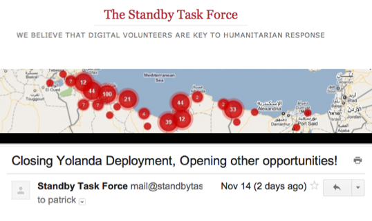 The second point that struck me occurred when the Standby Volunteer Task Force (SBTF) completed its deployment of MicroMappers on behalf of OCHA. The response from several SBTF volunteers was rather pointed—some were disappointed that the deployment had closed; others were downright upset. What happened next was very interesting; you see, these volunteers simply kept going, they used (hacked) the SBTF Skype Chat for Yolanda (which already had over 160 members) to self-organize and support other digital humanitarian efforts that were still ongoing. So the SBTF Team sent an email to it’s 1,000+ volunteers with the following subject header: “Closing Yolanda Deployment, Opening Other Opportunities!”