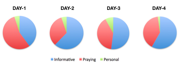 This series of pie charts simply reflects the relative share of tweets per category over the past four days.
