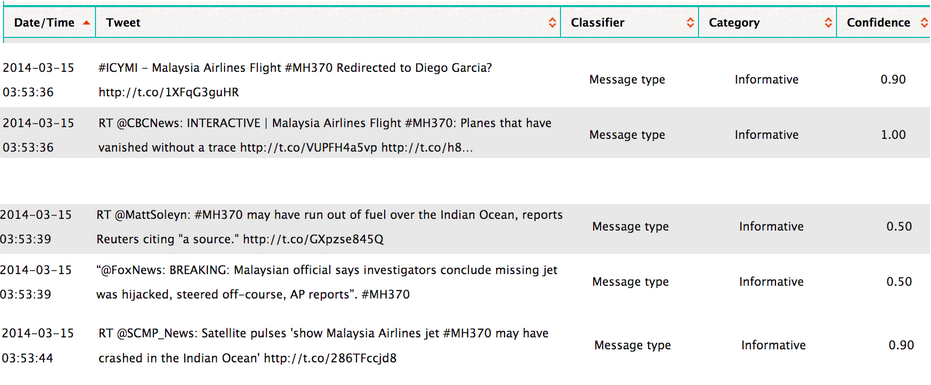 Below are some of the tweets that AIDR has automatically classified as being Informative (click to enlarge). The “Confidence” score simply reflects how confident AIDR is that it has correctly auto-classified a tweet. Note that Imran could also have crowdsourced the manual tagging—that is, he could have crowdsourced the process of teaching AIDR. To learn more about how AIDR works, please see this short overview and this research paper (PDF).