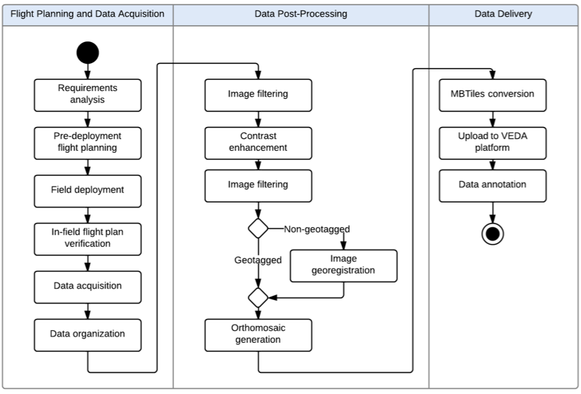 Data Delivery involves uploading the orthomosaics to a common, web-based platform that stakeholders can access. Orthomosaics “generally have large file sizes (e.g around 300MB for a 2 sq. km. render),” so the team created a web-based geographic information systems (GIS) to facilitate sharing of aerial maps. “The platform, named VEDA, allows viewing of rendered maps and adding metadata. The key advantage of using this platform is that the aerial imagery data is located in one place & can be accessed from any computer with a modern Internet browser. Before orthomosaics can be uploaded to the VEDA platform, they need to be converted into an approprate format supported by the platform. The current format used is MBTiles developed by Mapbox. The MBTiles format specifies how to partition a map image into smaller image tiles for web access. Once uploaded, the orthomosaic map can then be annotated with additional information, such as markers for points of interest.” The screenshot above (click to enlarge) shows the layout of a rendered orthomosaic in VEDA.
