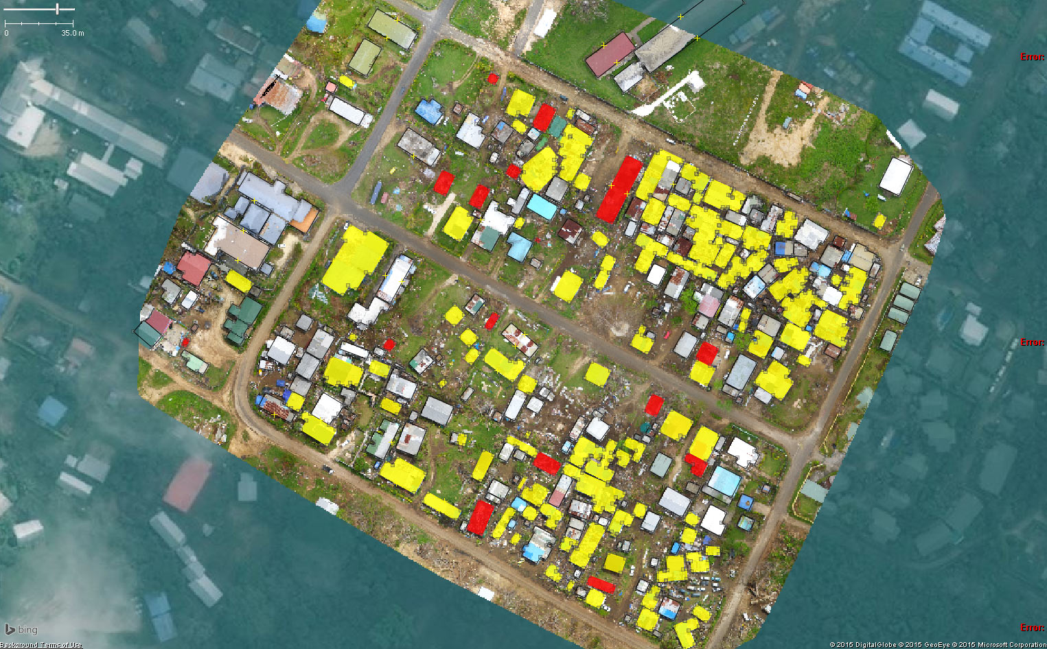 Unlike oblique images, point clouds give surveyors a full 3D view of an urban area, allowing them to “fly through” and inspect each building up close and from all angles. One need no longer be physically onsite, nor limited to simply one façade or a strictly field-based view to determine whether a given building is partially damaged. But what does partially damaged even mean when this kind of high resolution 3D data becomes available? Take this recent note from a Bank colleague with 15+ years of experience in disaster damage assessments: “In the [Bank’s] official Post-Disaster Needs Assessment, the classification used is to say that if a building is 40% damaged, it needs to be repaired. In my view this is too vague a description and not much help. When we say 40%, is it the volume of the building we are talking about or the structural components?”