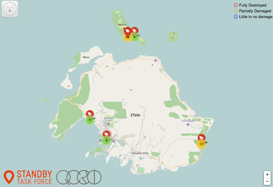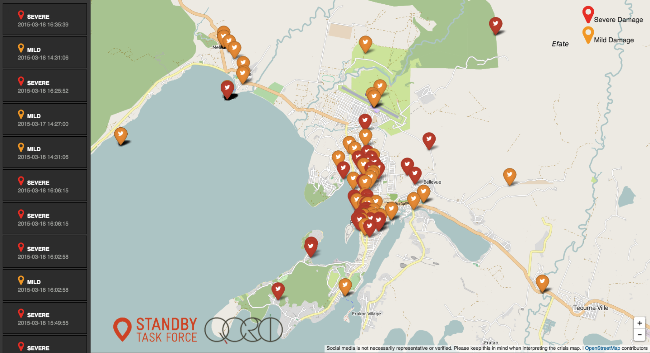 Digital Humanitarians sprung to action just hours after the Category 5 Cyclone collided with Vanuatu’s many islands. This first deployment focused on rapidly assessing the damage by analyzing multimedia content posted on social media and in the mainstream news. This request came directly from the United Nations (OCHA), which activated the Digital Humanitarian Network (DHN) to carry out the rapid damage assessment. So the Standby Task Force (SBTF), a founding member of the DHN, used QCRI′s MicroMappers platform to produce a digital, interactive Crisis Map of some 1,000+ geo-tagged pictures of disaster damage (screenshot below).