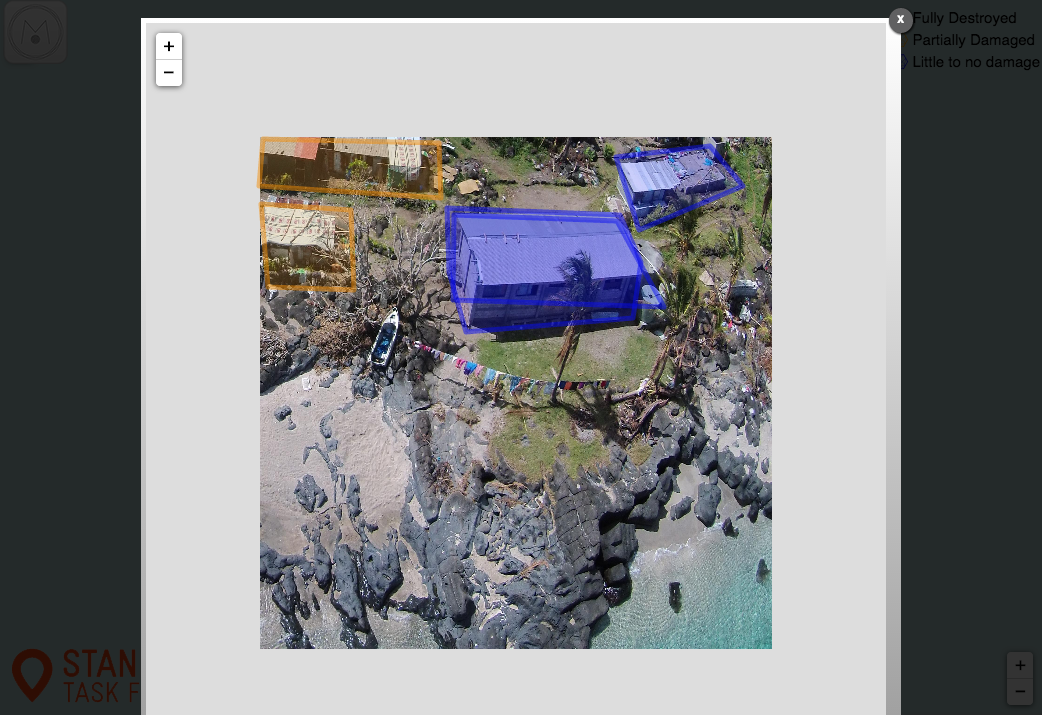Clicking on one of these markers will open up the high resolution aerial pictures taken at that location. Here, two houses are traced in blue (little to no damage) and two on the upper left are traced in orange (partial damage expected).