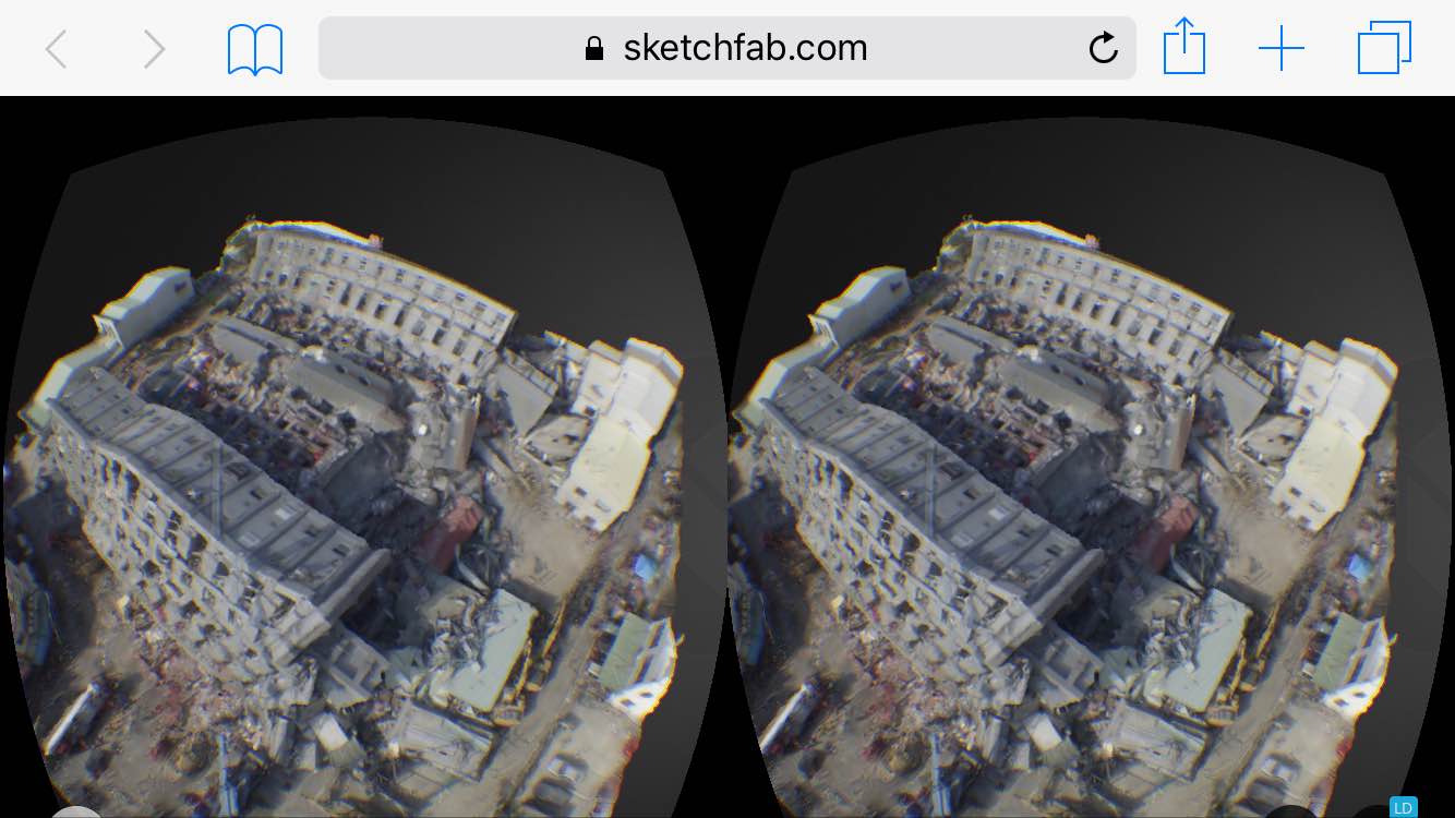 The model appears equally crisp when viewed in VR mode on a mobile device (using Google Cardboard in my case). Simply open this page on your mobile device to view the disaster damage in VR. This works rather well; the model does seem to be of high resolution in Virtual Reality as well.