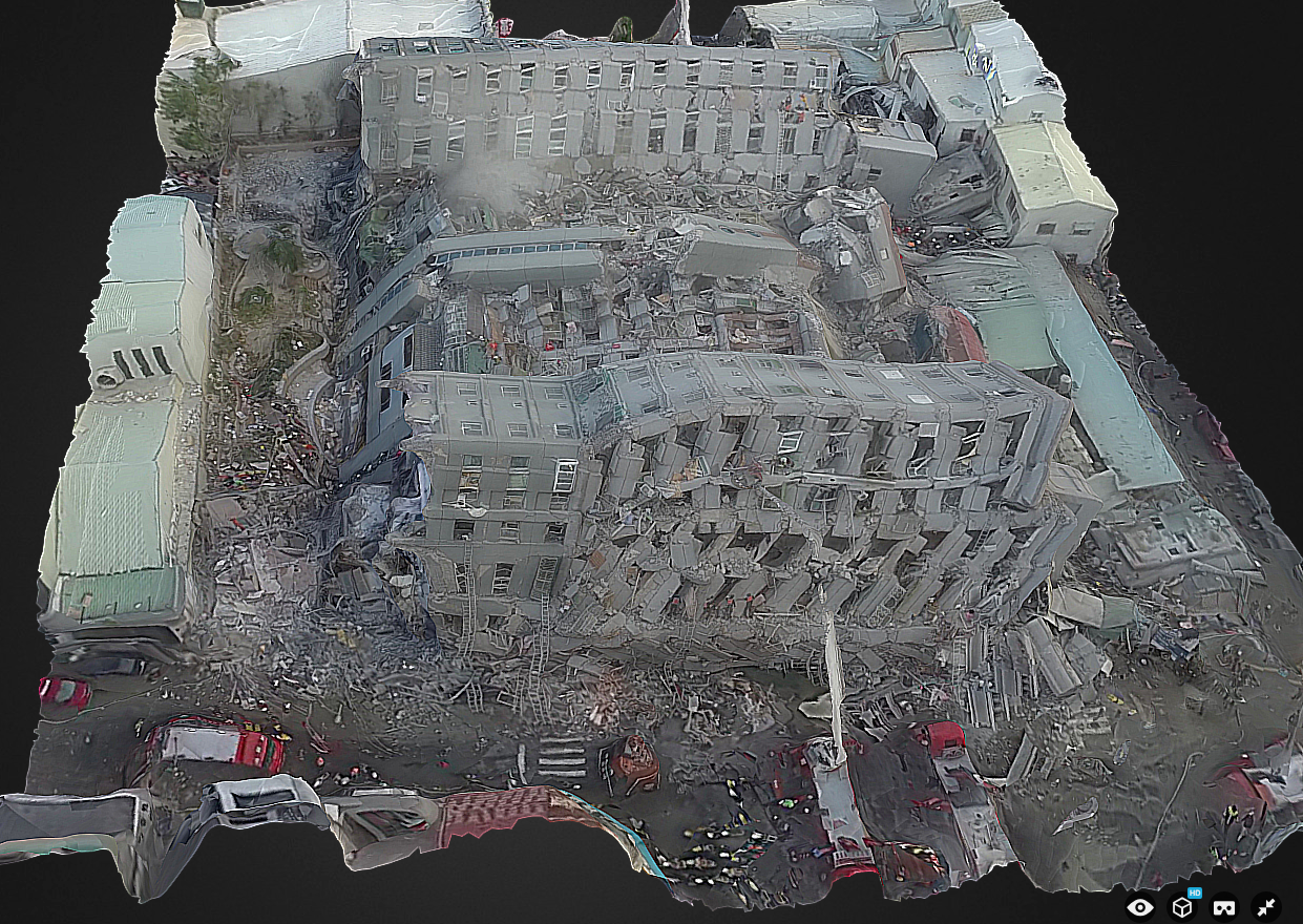 Within 10 hours of the earthquake, Dean Hosp at Taiwan’s National Cheng Kung University used screenshots of aerial videos posted on YouTube by various media outlets to create the 3D model below. As such, Dean used “second hand” data to create the model, which is why it is low resolution. Having the original imagery first hand would enable a far higher-res 3D model. Says Dean: “If I can fly myself, results can produce more fine and faster.”