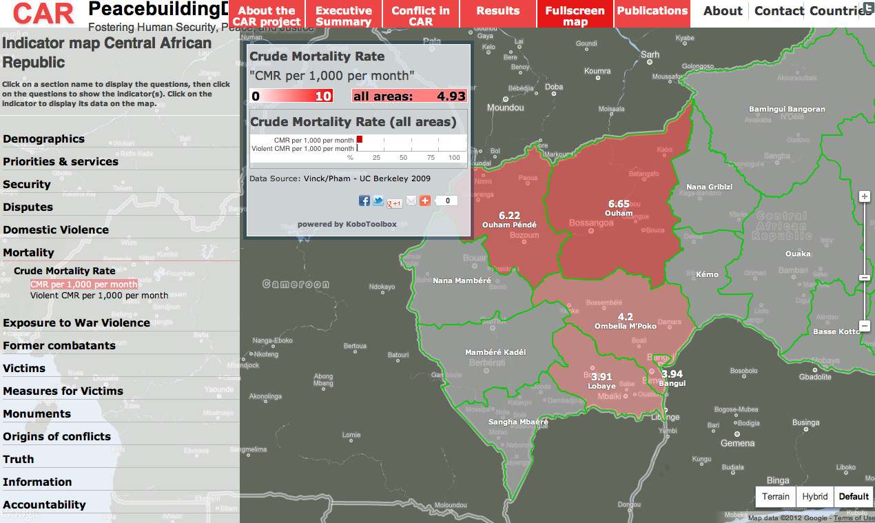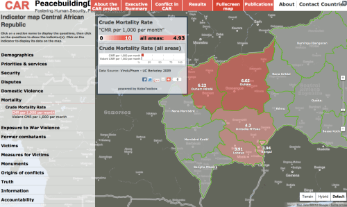I blogged about Gregory’s presentation following last year’s workshop, so this year I’ll relay Peter’s talk on research design and methodology vis-a-vis the collection of security incidents in conflict environments using SMS. Peter and mentor Macartan Humphreys completed their Voix des Kivus project in the DRC last year, which ran for just over 16 months. During this time, they received 4,783 text messages on security incidents using the FrontlineSMS platform. These messages were triaged and rerouted to several NGOs in the Kivus as well as the UN Mission there, MONUSCO.
