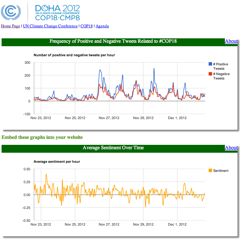 The first timeline displays the number of positive versus negative tweets posted with the COP18 hashtag. The tweets are automatically tagged as positive or negative using the SentiStrength algorithm, which has the same level of accuracy as that of a person if s/he were to manually tag the tweets. The second timeline simply depicts the average sentiment of #COP18 tweets. Both graphs are auto-matically updated every hour. Note that tweets in all languages are analyzed, not just English-language tweets.