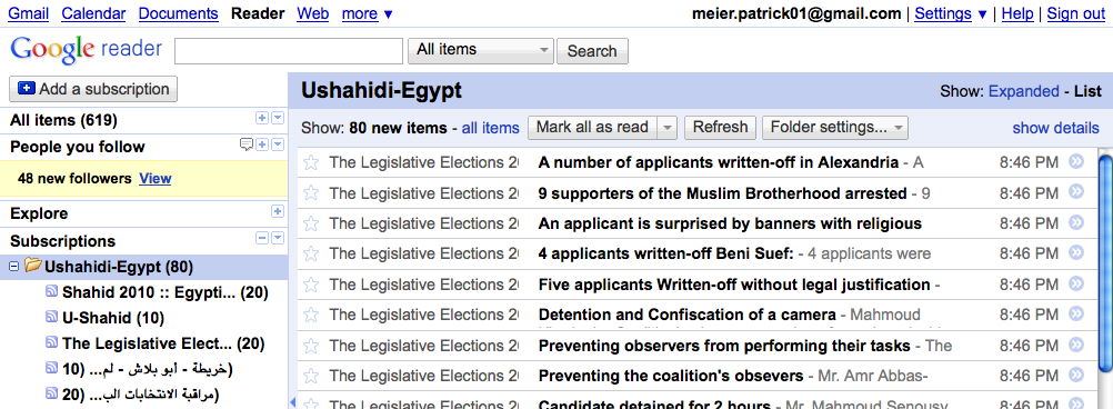 Again, has the world gone crazy? My ultimate nightmare, however, are APIs and RSS feeds. These allow data from different Ushahidi platforms to be easily shared. Just look at the screenshot below and you’ll understand my concerns. I was able to create one list of all reports simply by cutting and pasting the five website links into my Google Reader. This link will take you to a public website with one list of integrated reports from all five platforms updated in real-time. If you’d like to add this to your own Google Reader, use this Atom Feed.