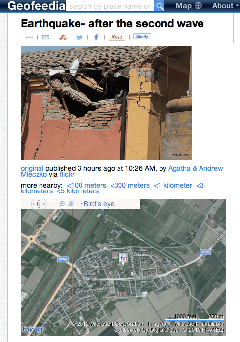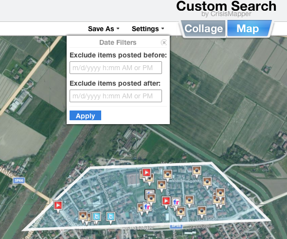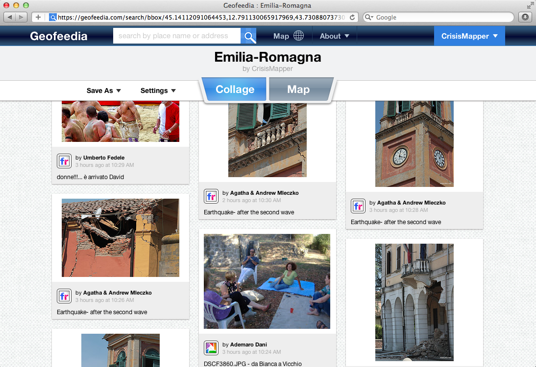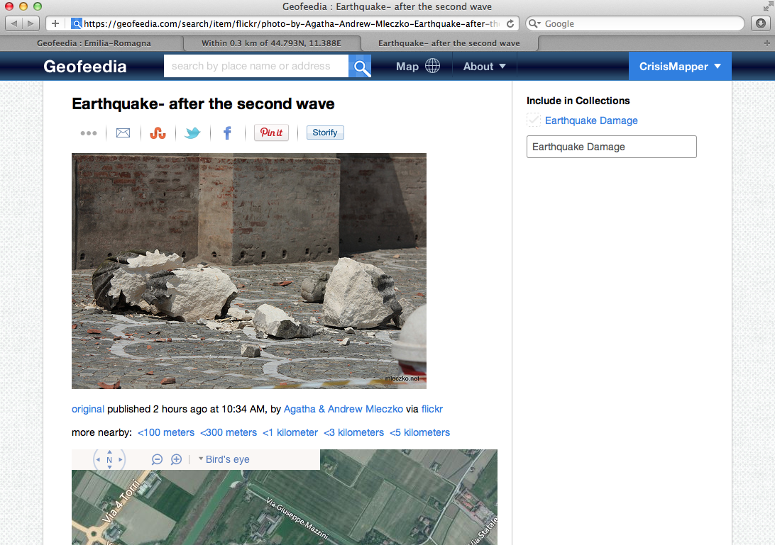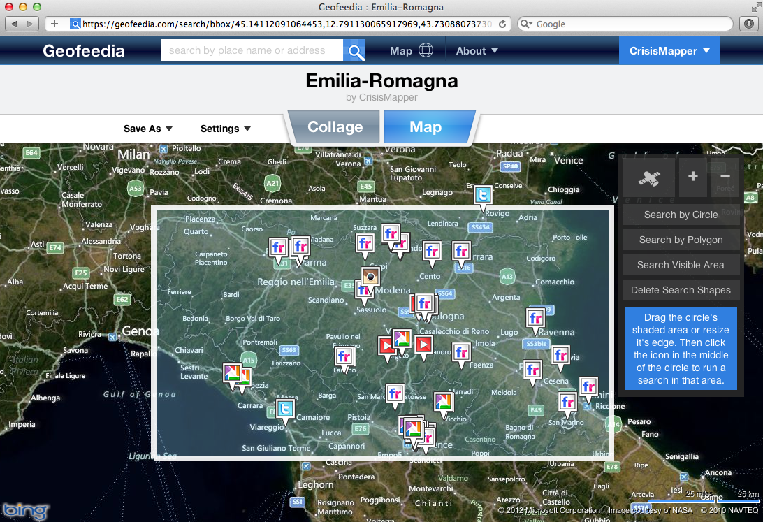 My first blog post on GeoFeedia was entitled “GeoFeedia: Next Generation Crisis Mapping Technology?” The answer today is a definite “Yes!” While the platform was not originally designed with disaster response in mind, the team has since been adding important features that make the tool increasingly useful for humanitarian applications. And GeoFeedia has plans for more exciting develop-ments in 2013. Their commitment to innovation and strong continued interest in supporting digital disaster response is why I’m hoping to work more closely with them in the years to come. For example, our AIDR (Artificial Intelligence for Disaster Response) platform would really add a strong Machine Learning com-ponent to GeoFeedia’s search function, in effect enabling the tool to go beyond simple keyword search.