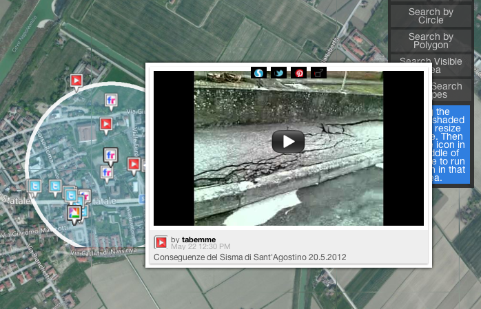 The 1-minute video is well worth watching if you’re new to GeoFeedia. The plat-form enables hyper local searches for information by location across multiple social media channels such as Twitter, Youtube, Flickr, Picasa & now Instagram. One of my favorite GeoFeedia features is the awesome geofeed (digital fence), which you can learn more about here. So what’s new besides Instagram? Well, the first suggestion I made last year was to provide users with the option of searching by both location and topic, rather than just location alone. And presto, this now possible, which means that digital humanitarians today can zoom into a disaster-affected area and filter by social media type, date and hashtag. This makes the geofeed feature even more compelling for crisis response, especially since geofeeds can also be saved and shared.