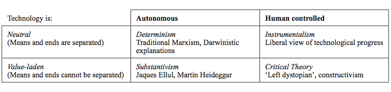 Muki explores this assertion by delving into the various meanings of demo-cratization. He adopts the specific notion of democratization that “evokes ideas about participation, equality, the right to influence decision making, support to individual and group rights, access to resources and opportunities, etc.” With this definition in hand, Muki argues that “using this stronger interpretation of democratization reveals the limitation of current neogeographic practices and opens up the possibility of considering alternative development of technologies that can, indeed, be considered democratizing.” To explore this further, he turns to Andrew Feenberg‘s critical philosophy of technology. Feenberg identifies “four main streams of thought on the essence of technology and its linkage to society: instrumentalism, determinism, substantivism & critical theory.”