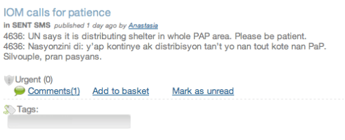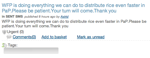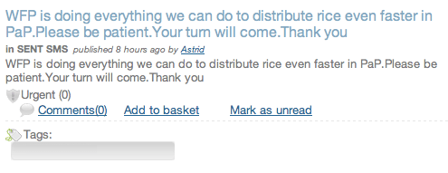 Both communication features are revolutionizing disaster response. Lets take the supply-side approach first. EIS together with WFP, UNICEF, IOM, the Red Cross and others are using the system to send out SMS to all ~7,500 mobile phones (the number is increasing daily) with important information updates. Here are screen shots of the latest messages sent out from the EIS system: