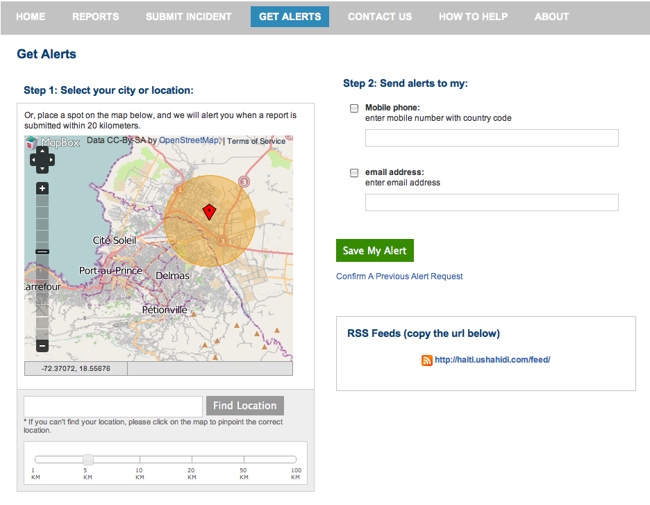 Ushahidi takes both a demand-side and supply-side approach by using the 4636 SMS system. 4636 is used to solicit text messages from individuals in urgent need. These SMS’s are then geo-tagged in near real-time on Ushahidi’s interactive map of Haiti. In addition, Ushahidi provides a feature for users to receive alerts about specific geographic locations. As the screen shot below depicts, users can specify the location and geographical radius they want to receive information on via automated email and/or SMS alerts; i.e., supply-side.