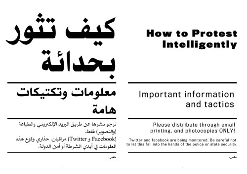 Above is the first page of a 26-page how-to guide circulated in both hard- and electronic-copy during the first wave of protests in Egypt. The document was translated into English by The Atlantic and outlines a number of critical points central to civil resistance, including very specific demands on the Mubarak regime; concrete goals for the popular resistance and tactical steps to achieve these stated goals. The guide also provided tips on what protection gear to wear and how to engage the police with the use of spray paint.