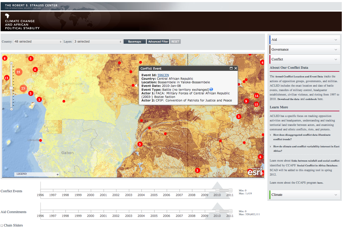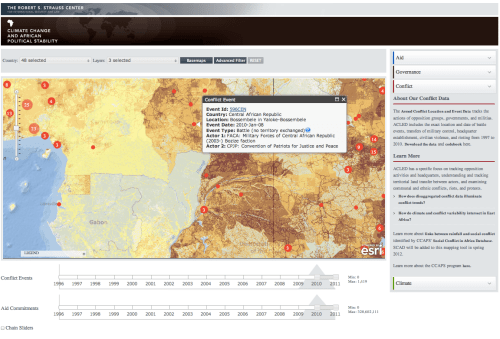 Josh and team just released the pilot version of its dynamic mapping tool, which aims to provide the most comprehensive view yet of climate change and security in Africa. The platform, developed in partnership with AidData, enables users to “visualize data on climate change vulnerability, conflict, and aid, and to analyze how these issues intersect in Africa.” The tool is powered by ESRI technology and allows researchers as well as policymakers to “select and layer any combination of CCAPS data onto one map to assess how myriad climate change impacts and responses intersect. For example, mapping conflict data over climate vulnera-bility data can assess how local conflict patterns could exacerbate climate-induced insecurity in a region. It also shows how conflict dynamics are changing over time and space.”
