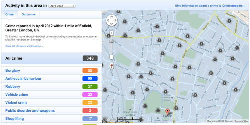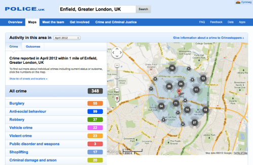 In addition, the presentation of “crime statistics on the national website is very passive, offering little that will draw people back and keep them interested on crime trends and policing in their area.” For example, the project did not require users to register their email addresses and home post (zip) codes when using the map. This meant the police had no way to inform interested audiences with locally relevant crime information such as “specific and tailored crime prevention advice regarding a known local crime issue (e.g. a spate of burglaries), directly promoting messages of reassurance and used as a means to publicize police activity.” I would personally argue for the use of automated alerts and messages of reassurance via geo-fencing. (The LA Crime Map provides automated alerts, for example). I would also recommend social networking tools such as Facebook and Twitter to the map.