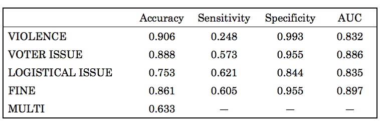 AIME was rather good at correctly tagging tweets related to “Voting Issues” (98% accuracy) but drastically poor at tagging related to “Election Rigging” (0%). This is not AIME’s fault : ) since it only had 8 examples to learn from. As for “Violence”, the accuracy score was 47%, which is actually surprising given that AIME only had 14 human-tagged examples to learn from. Lastly, AIME did fairly well at auto-classifying unrelated tweets (accuracy of 86%).
