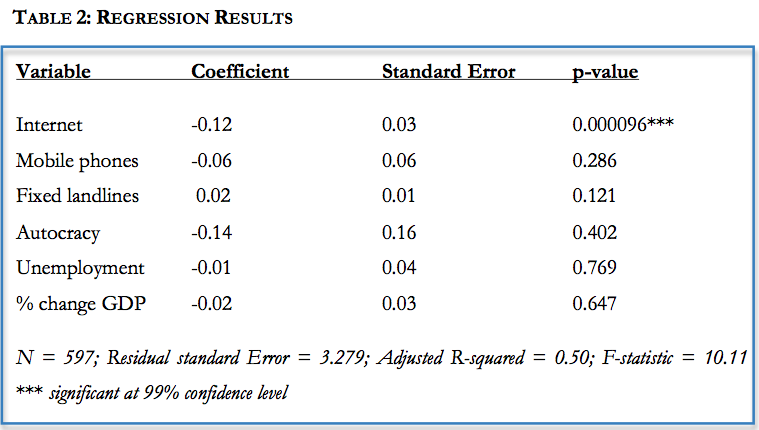 One question that naturally follows is what form that immediate instability takes? Does the rapid diffusion of communication tools facilitate the organization, mobilization and coordination of anti-government protests, which then contributes to political instability? I decided to find out whether new communication technologies do lead to more frequent protests. Please see the Slideshare presentation for specifics on the regression analysis (thanks to Dr. Stodden and Dr. Woodard for their assistance on the quantitative analysis). As my research is still ongoing and my findings preliminary, I hesitate to make any definite conclusions. With this caveate in mind, here are the tentative results.