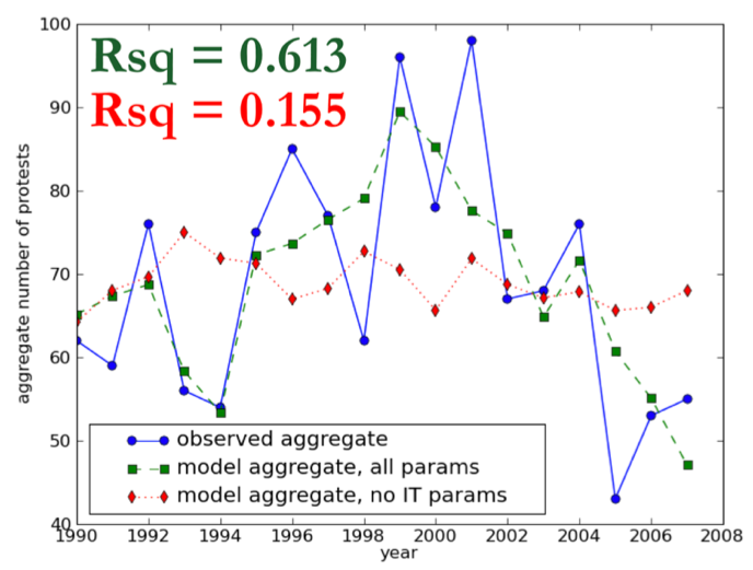 The above results are equally surprising. The blue curve is a time series of observed political protests. The green curve is my complete model which includes ICT independent variables as well as my political and economic control variables. The red curve represents the model without the ICT variables. The large difference between the two adjusted R squared figures is rather striking, not to mention that an R squared of 0.613 seems rather high.