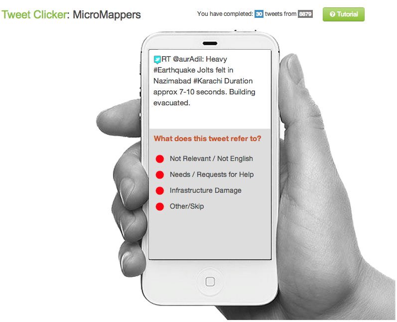 MicroMappers is simply a collection of microtasking apps (we call them Clickers) that we have customized for disaster response purposes. We just launched both the Tweet and Image Clickers to support the earthquake relief and may also launch the Tweet and Image GeoClickers as well in the next 24 hours. The TweetClicker is pictured below (click to enlarge).